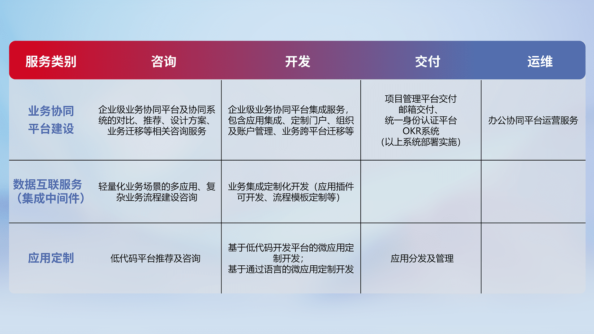 针对钉钉、、企微、、、IDaas等平台级产品提供产品的规划、、、、方案、、、、交付、、、、定制化开发等服务,,,实现如统一协同办公、、、智能客户服务、、、混合会议管理、、智能数据查询、、、等业务场景,,实现数字化转型。。。。