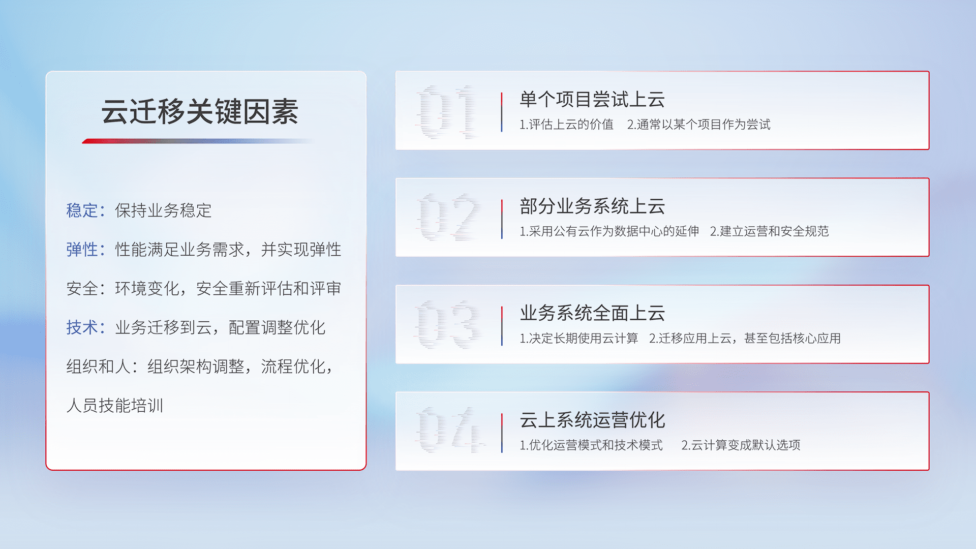 结合实际业务,,从规划设计、、、、云平台选型、、云原生改造、、、、数据迁移、、集成交付,,,,迁移全过程为客户识别最佳上云路径,,做好风险识别管理,,设计网络架构、、身份权限、、、安全审计合规、、、操作审计、、、日志审计、、、监控告警策略、、多站点容灾设计等,,,对云上基础设施进行整体规划,,提升IT治理水平,,,以满足弹性、、高可用、、、、高性能的需求。。。。