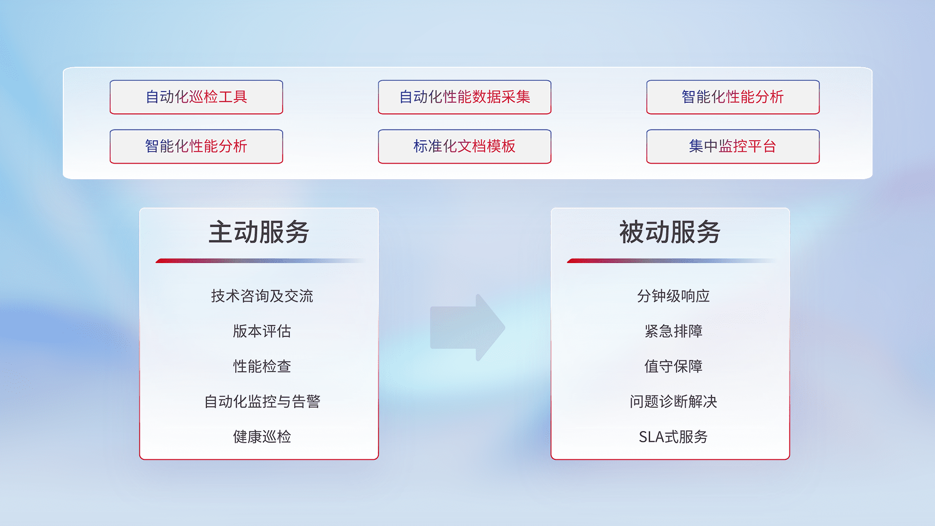 智能化工具和标准化文档,,保障服务质量,,提供主动服务(包含技术咨询、、、版本评估、、、、性能检查、、自动化监控与告警、、、健康巡检)和被动服务包含(分钟级响应、、、紧急排障、、、值守保障、、、问题诊断解决、、、、SLA服务)。。